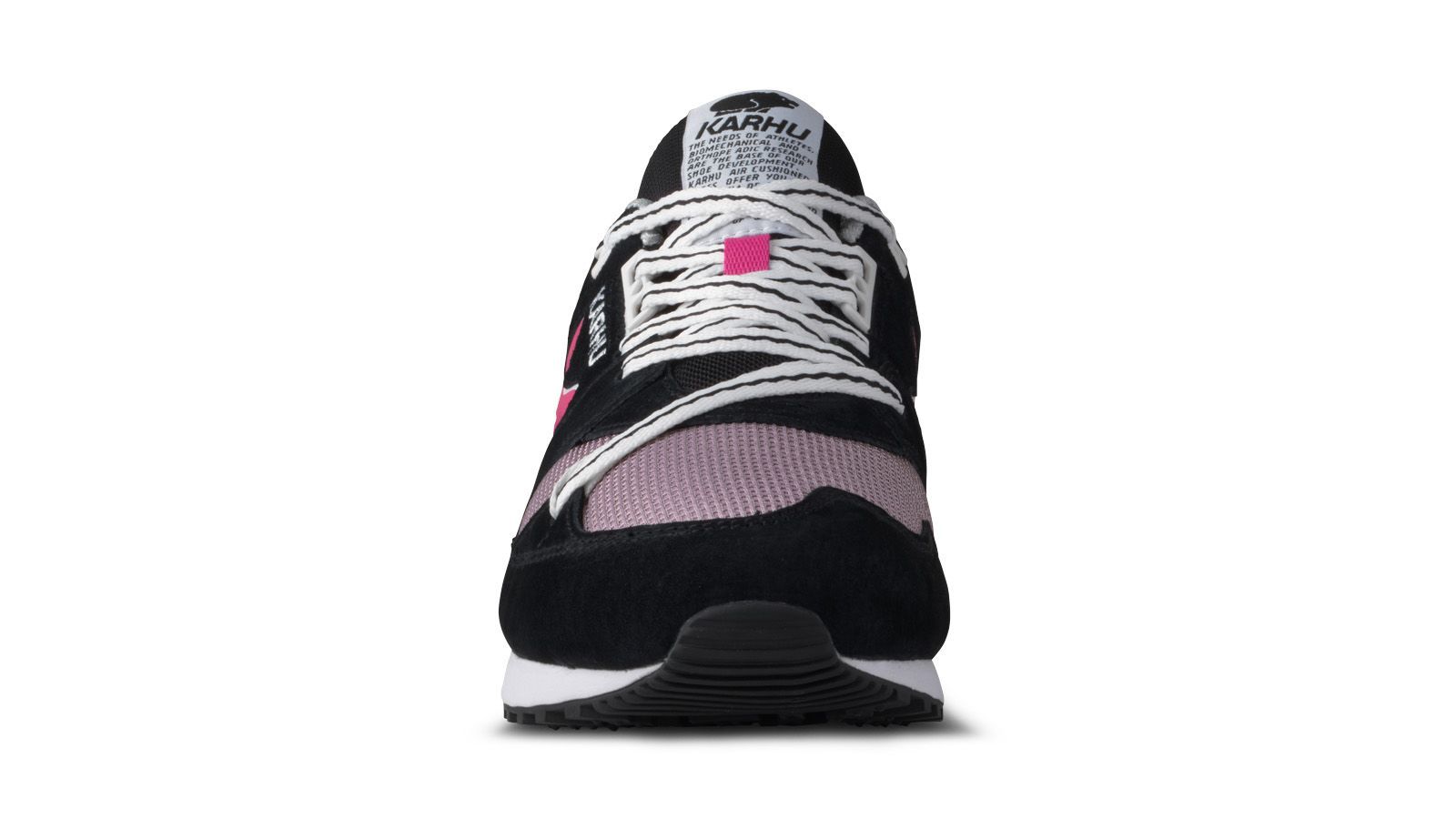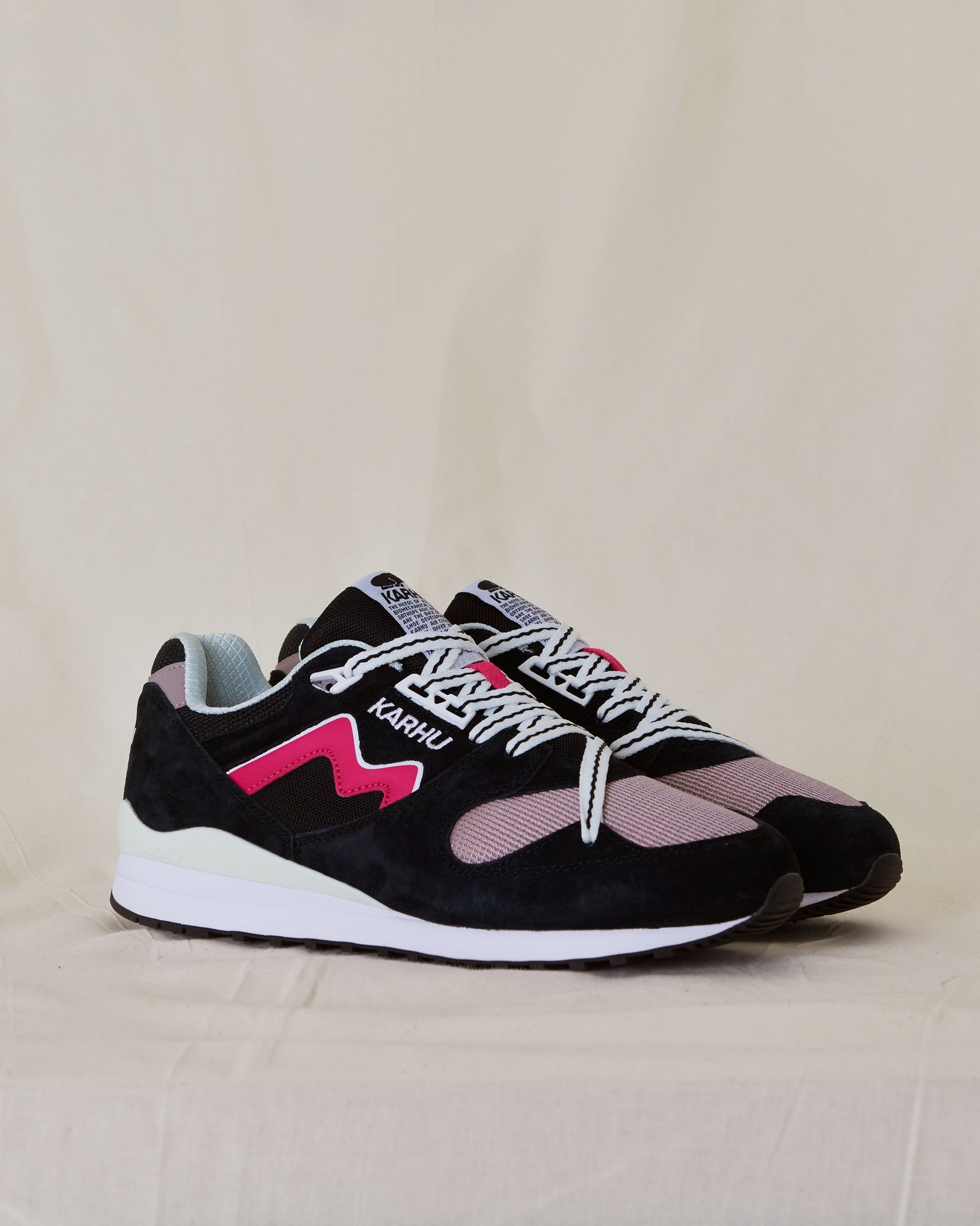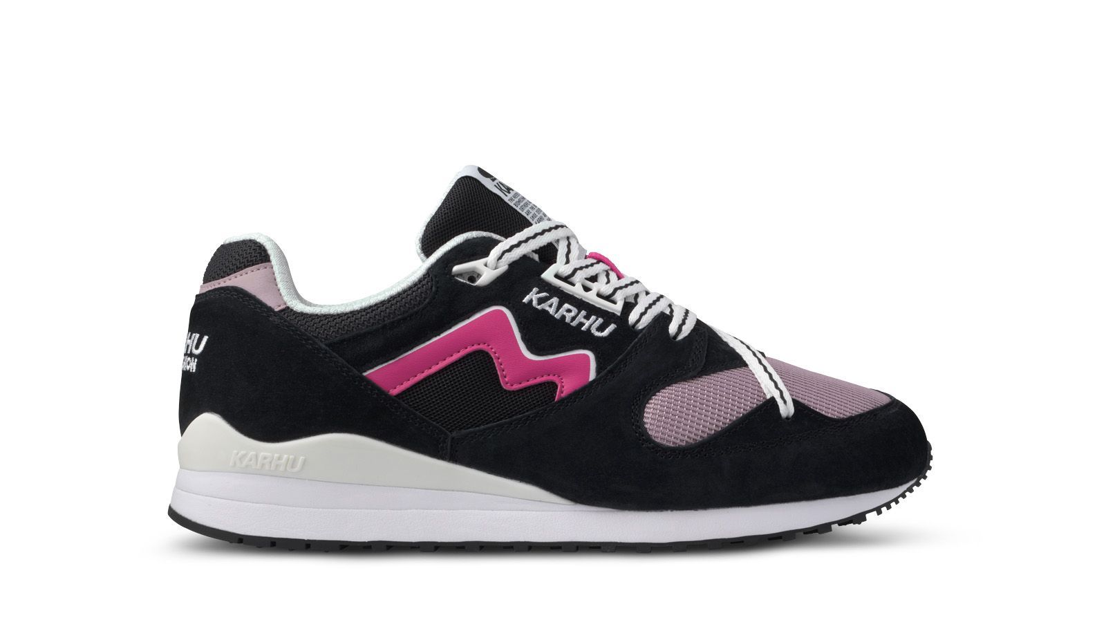Let op: de vermelde maten zijn US maten. Karhu Synchron Classic sneaker in de kleur Jet Black/Cabaret. Ten opzichte van een normale schoenmaat vallen Karhu sneakers 1 tot 1,5 maat te klein! Karhu, het Finse woord voor beer, is van orgine een merk voor sportartikelen. Het merk verkoopt al sportartikelen sinds 1916. Tot 1950 hadden ze 3 strepen als logo, dit logo hebben ze toen verkocht aan een Duits sportmerk die nog steeds gebruik maakt van dit logo. Het merk Karhu staat nu vooral bekend om de sneakers met bijzondere kleurcombinaties. Ze brengen de sneakers gedurende het seizoen uit door middel van verschillende drops. De schoenen droppen eenmalig in een colorway.