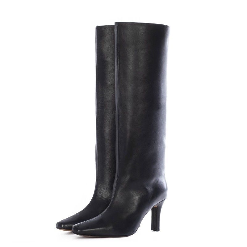 Deze zwarte laarzen van Toral vallen op maat.-Hakhoogte ca. 8cm-Schachthoogte ca. 47cm (EU-maat 37)-Schachtbreedte ca. 38cm (EU-maat 37)-Vierkante neus-Bovenwerk: leer-Voering en binnenzool: leer-Zool: leer