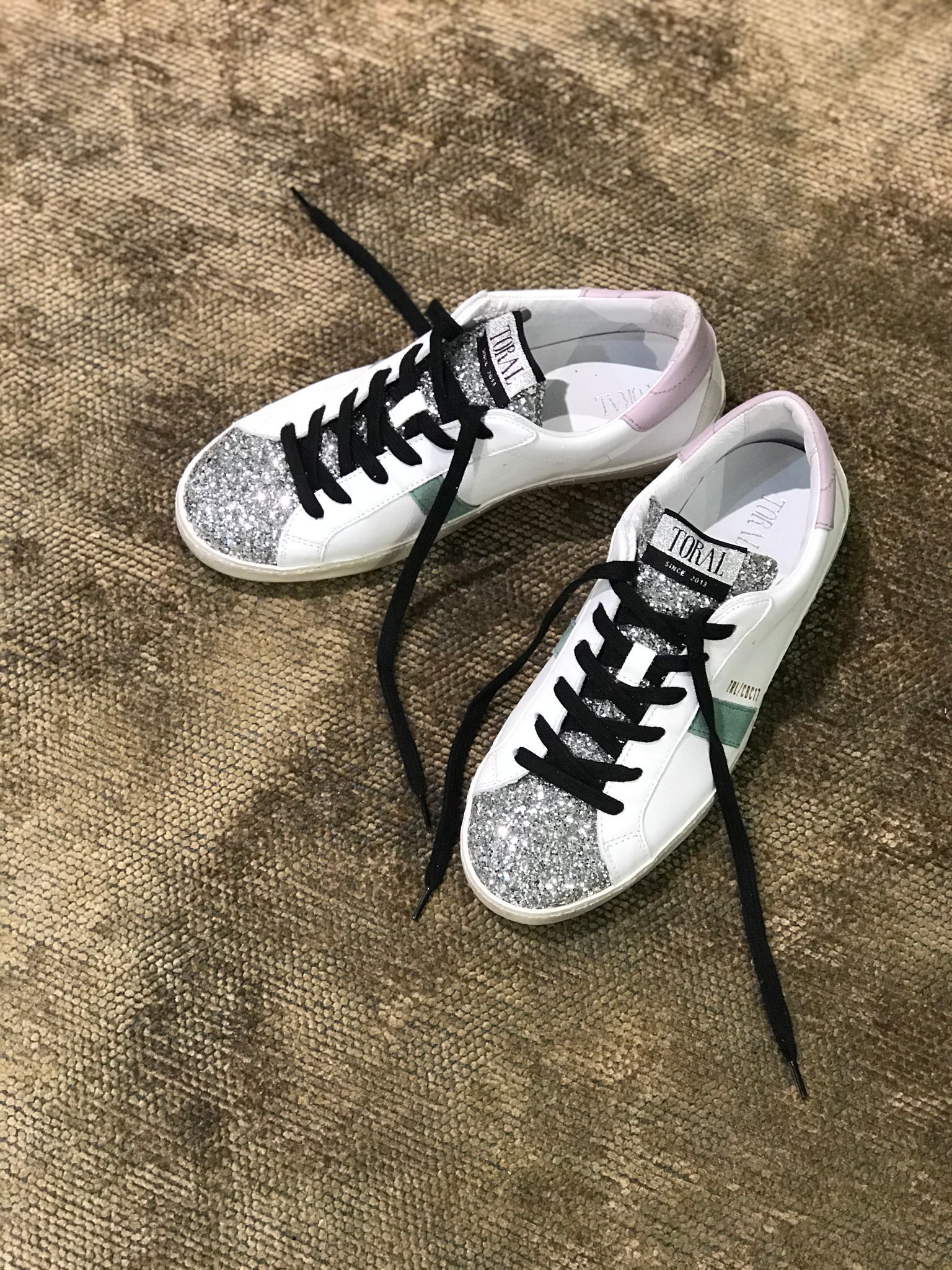 Deze witte dames sneakers van Toral vallen op maat en hebben een rubberen zool van ongeveer 3 centimeter. Als u vragen over het product heeft, kunt u altijd contact met ons opnemen.